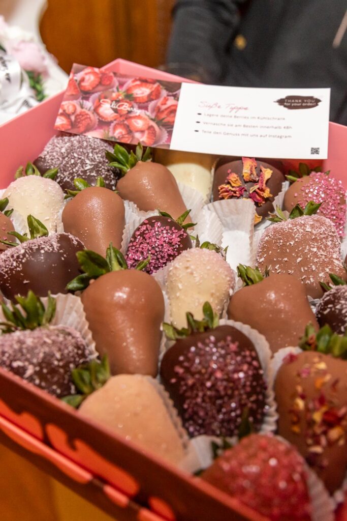 Natürlich kam auch das leibliche Wohl nicht zu kurz: Während man sich verwöhnen lassen konnte, gab es feinste Drinks und exquisites Fingerfood. Schon beim Betreten wurde man mit einem prickelnden Glas Schlumberger Sekt begrüßt – weil Selfcare am besten in Kombination mit ein bisschen Glamour schmeckt! Und weil ein Hauch von Süße nie schadet, warteten köstliche, handgefertigte Schokobeeren von Saliberry.