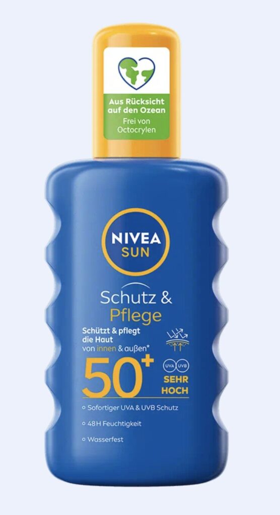 Das NIVEA SUN Schutz & Pflege LSF 50+ Sonnenspray schützt zuverlässig vor UV-Strahlung und spendet 48h Feuchtigkeit. Aus Rücksicht auf den Ozean frei von Octocrylen & Mikroplastik: NIVEA SUN Schutz und Pflege Sonnenspray LSF 50+.Es bietet einen hohen, sofort wirksamen und wasserfesten UVA- und UVB-Schutz gegen Sonnenbrand und vorzeitige Hautalterung LSF 50+ schützt und pflegt die Haut von innen & außen. Zusätzlich versorgt sie die Haut mit 48h Feuchtigkeit und unterstützt den Hautschutz von innen mit dem Antioxidans Vitamin EDas NIVEA Sonnenspray mit LSF 50+ verzichtet bewusst auf den Einsatz der umweltschädlichen UV-Filter Octocrylen, Octinoxat und Oxybenzon und ist frei von Mikroplastik – aus Rücksicht auf den Ozean.