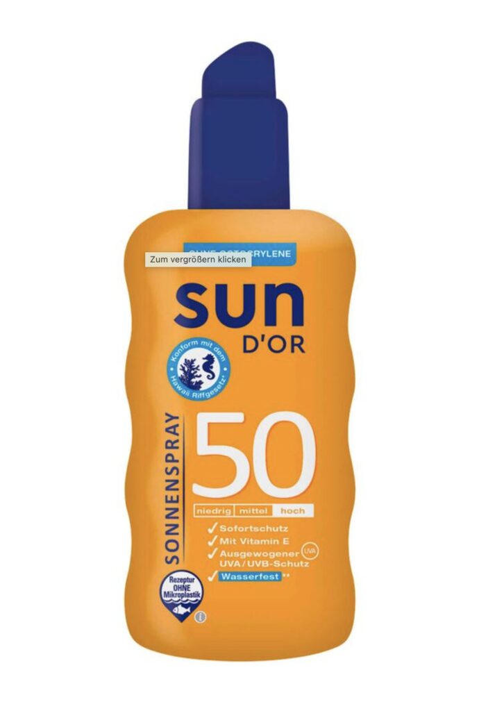 Sonnige Aussichten! Ob am Strand, in der Stadt oder auf dem Wasser – das sun D’OR Sonnenspray transparent LSF 30 ist der ideale Begleiter und bietet zuverlässigen Schutz vor der Sonne. Zu diesem Urteil kommt auch das Verbrauchermagazin Stiftung Warentest in seiner Juli-Ausgabe (07/2024) im Test „Sonnenschutzmittel“. Das Ergebnis: sun D’OR Sonnenspray transparent LSF 30 ist nicht nur eines der preisgünstigsten Produkte im Test, sondern noch dazu Testsieger unter 20 getesteten Sonnenschutzmitteln und erhält das Stiftung Warentest-Qualitätsurteil „sehr gut“ (Gesamtnote 1,4) – wenn das kein Grund zum Strahlen ist.Transparentes Sonnenspray; LSF 30 hoch; Sofortschutz; Zieht schnell ein und fettet nicht; Hinterlässt keine weißen Rückstände; Ausgewogener UVA- und UVB-Schutz; Extra wasserfest; Ohne Octocrylene.