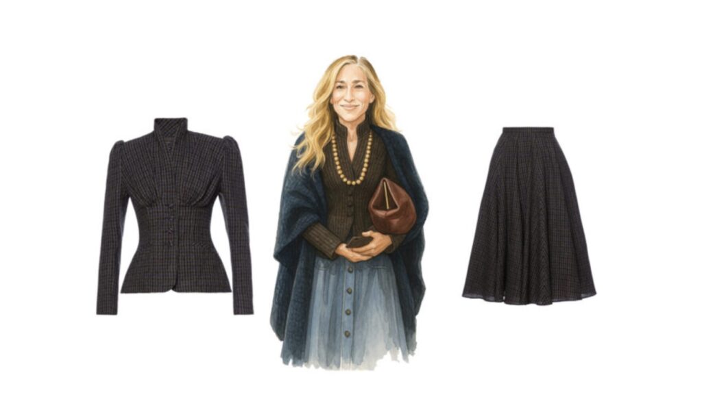 Bei Dreharbeiten zur dritten Staffel wurde SJP in einer karierten Blazer-Jacke aus der Lena Hoschek Business-Linie gesichtet – stilvoll und smart zugleich. In der Serie kombiniert Carrie das Piece mit Denim und High Heels – ein Look zwischen Office und Coffee-Date, typisch Bradshaw, typisch New York.