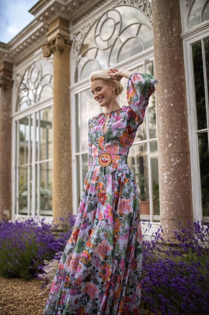 Die Leichtigkeit des Seins – mit dem edlen „Bliss“-Kleid von Lena Hoschek. Der leichte Voile-Stoff umspielt den Körper sanft und verführt in floralem Design. On top sorgen Strassknöpfe an der Knopfleiste und den märchenhaften Puffärmeln für ein funkelndes Finish.