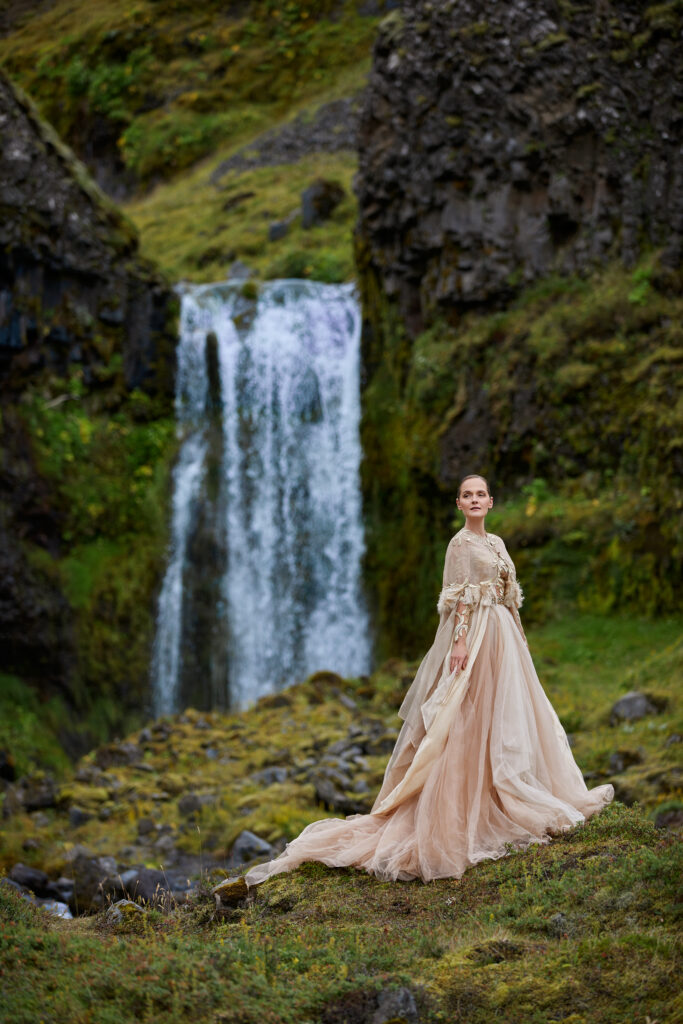 Die dreiteilige beige- goldene Couture-Robe von Eva Poleschinski begeistert mit einem kunstvoll bestickten Body und einem Tüllrock, der keine Wünsche offenlässt – beides veredelt mit einem grandiosen Seiden-Cape mit aparter Goldstickerei und farblich abgestimmtem Federschmuck.