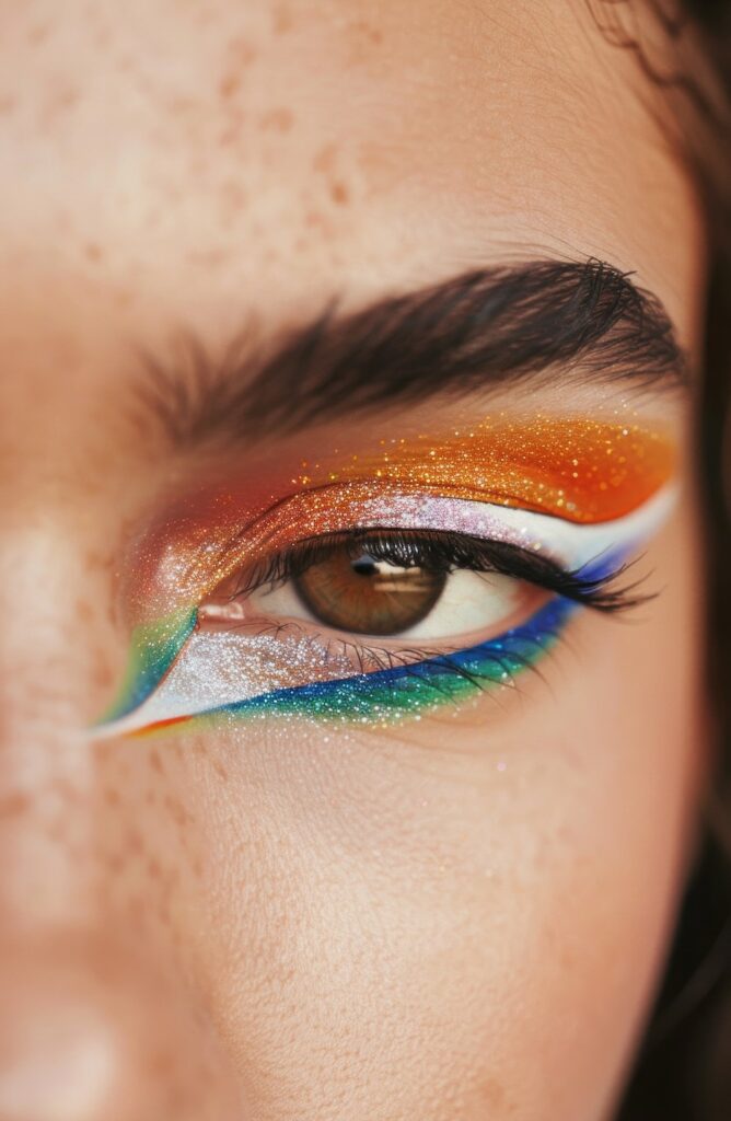Einer der auffälligsten Aspekte des New Wave Looks? Die Farben. Von Türkis über Magenta bis hin zu Metallic-Gold – erlaubt ist, was knallt. Besonders angesagt: Farbige Eyeliner in geometrischen Formen oder im Doppelwing-Look, die den Augen sofort diesen Retro-Futurismus verleihen.