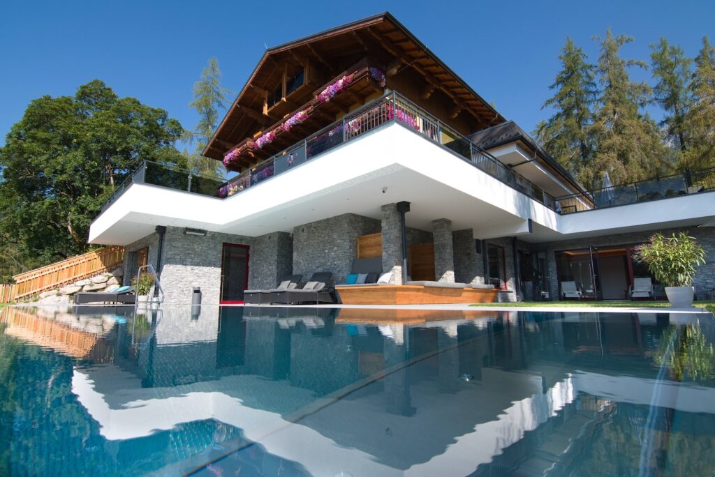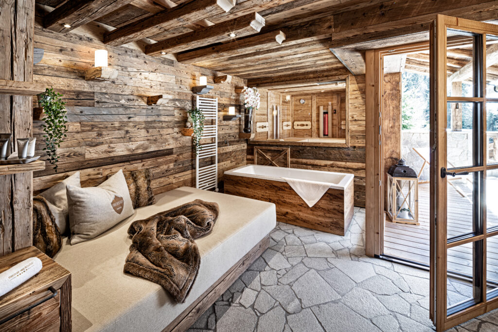 Jedes Chalet begeistert mit einem eigenen Alm-Spa: Panoramawanne, Hot Tub auf der Sonnenterrasse, private Sauna mit finnischer, Dampf- und Infrarotfunktion – und in der Pool Luxury Lodge sogar mit einem 14 × 4 Meter großen, beheizten Infinity Pool.