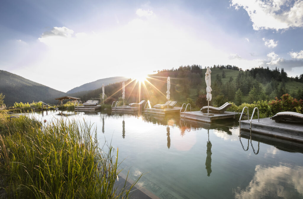 Das 5.000 m² große A.L.M. Refugium begeistert mit Infinity Pool, Indoor-Panoramapool, beheiztem Naturschwimmteich, Eisdusche, Infrarotkabine, Bio-Almkräutersauna, Aroma-Dampfbad und einer Saunalandschaft, die zum alpinen Waldbaden einlädt.