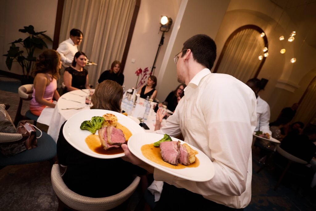 Schon beim Betreten des prachtvoll geschmückten Festsaals lag ein Hauch von Haute Couture in der Luft – kein Wunder, denn einer der absoluten Höhepunkte des Abends war die grandiose Fashion Show der MODE WIEN. Heimische Designer:innen präsentierten erlesene Festtags-Roben, die mit raffinierten Schnitten, fließenden Stoffen und glitzernden Details verzauberten. Für die perfekten Looks sorgten die talentierten Teams der Friseursalons der WKA, die mit kunstvollen Stylings für den finalen Glamour sorgten.