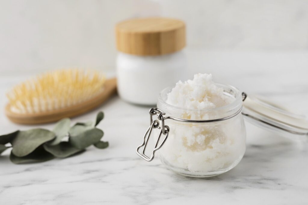 3 EL feiner Zucker werden mit 2 EL Kokosöl vermischt, optional ergänzt durch ein paar Tropfen ätherisches Zitronen- oder Vanilleöl. In ein Glas füllen und innerhalb weniger Wochen verbrauchen.
