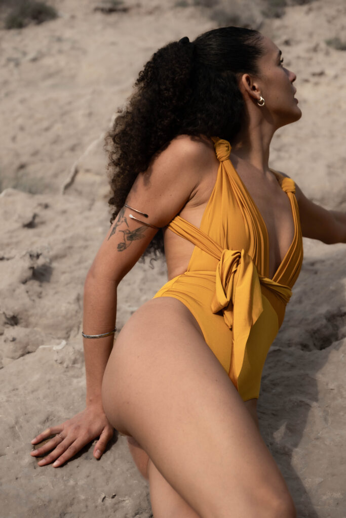 Alle Swimsuits der The Dunes Collection sind echte Verwandlungskünstler. Wende-Badeanzug und Body in einem – tragbar in Unicolour oder Two-Tone. Dazu kommen unzählige Bindevarianten: klassisch, asymmetrisch, verspielt oder super clean. Jedes Tragen fühlt sich wie ein neues Design an. Und ja, es sind locker um die 100 Möglichkeiten. Langweilig wird hier garantiert nichts.