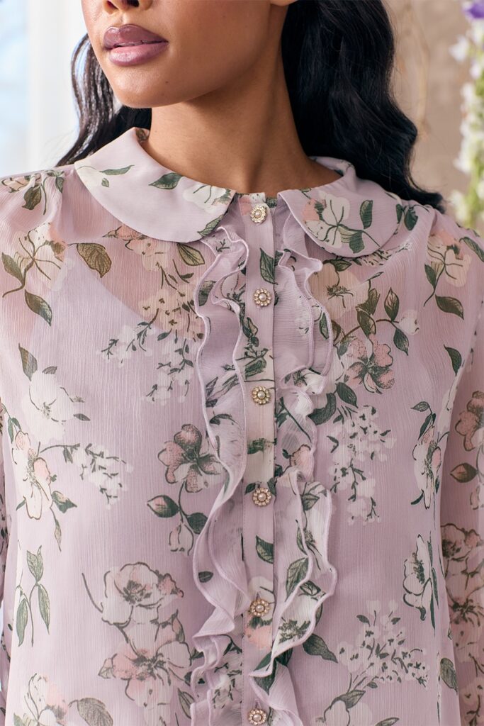 Fließende Stoffe, sanfte Silhouetten und liebevolle Details greifen die romantische Bildsprache der Serie auf, ohne kostümiert zu wirken. Stattdessen entsteht ein Look, der feminin, elegant und alltagstauglich zugleich ist – perfekt für alle, die ein bisschen Serienmagie im eigenen Stil aufleben lassen möchten. Von zartem Chiffon mit Rüschen, strukturierten Jacquard-Hosen, verspieltem Tüll bis Spitze und schimmerndem Lurex mit metallischen Fäden. Samtbänder, glänzende Knöpfe, Strassdetails, Plissee-Falten und florale Prints sorgen für jene dramatische Note, die Bridgerton so unverwechselbar macht.