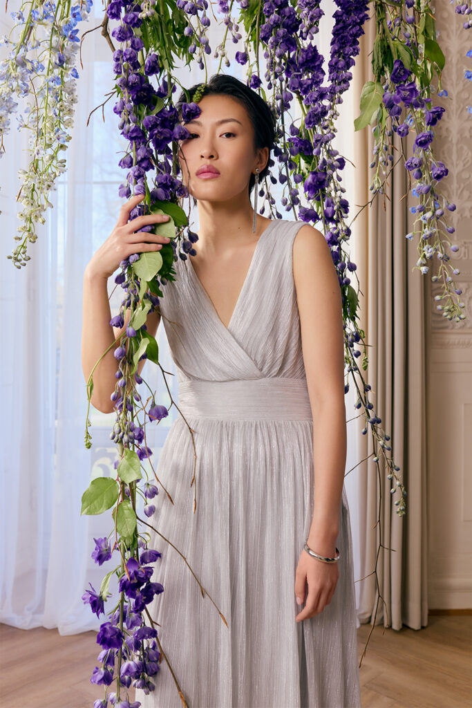 Dunkle Töne treten in den Hintergrund, selbst kräftige Farben erscheinen sanft aufgehellt. Stoffe bewegen sich visuell in einer Atmosphäre aus Blütenfarben, Morgenlicht und frischer Luft. Die Mode entfaltet sich nicht vor herbstlichem Laub, sondern vor floralen Kulissen und hellem Grün – ein visuelles Statement, das der Serie wieder mehr Verspieltheit, Romantik und verträumte Eleganz verleiht.