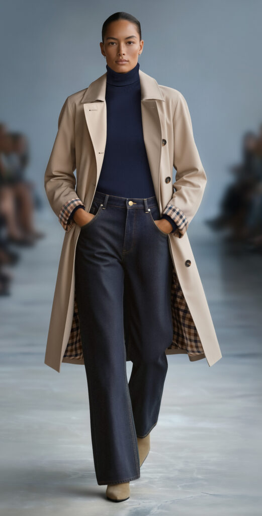Loose-Fit-Jeans zu weißem Shirt, Oversize-Sweater und Retro-Sneakern wirken sportlich und entspannt. Für elegantere Momente sorgen dunkle Bootcut-Jeans mit blauem Pullover, Trenchcoat und Stiefeletten in Braun oder Beige. Zeitlos? Absolut. Langweilig? Niemals.