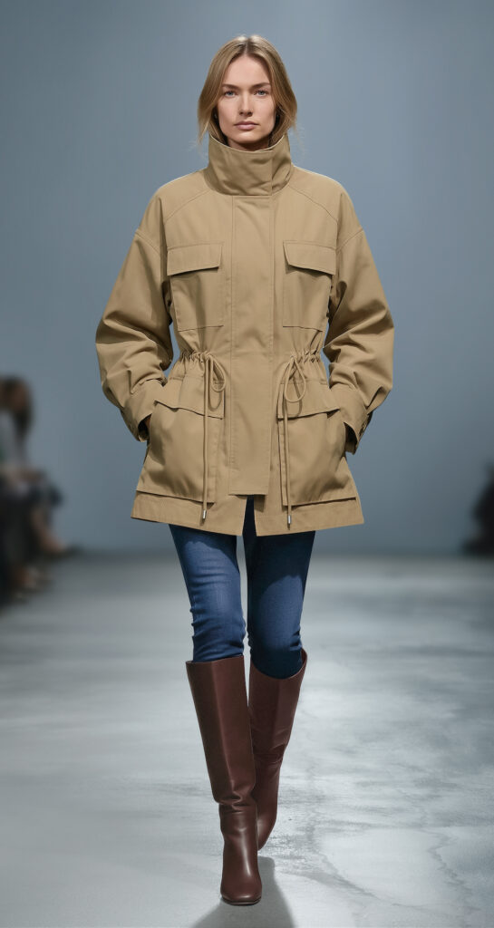 Als praktische Outerwear funktionieren Stehkragen-Jacken genauso gut wie als zentrales Fashion-Statement. Wer es im Sinne des Quiet Luxury elegant mag, setzt auf gedeckte Nuancen wie Camel oder Khaki. Dazu schmale Jeans oder dunkle Stoffhosen, ein Argyle-Pullover, Oxford-Hemd und Reiterstiefel – fertig ist der Look mit Understatement-Attitüde. Lässiger wird es mit Utility-Jeansjacke, Hoodie, Straight-Leg-Jeans und Sneakern. Ein Stil, der nach „Ich hab mir Mühe gegeben“ aussieht – ohne es laut zu sagen.
