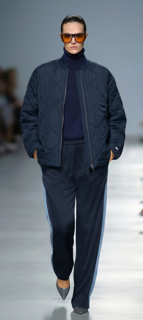 Monochrome Outfits stehen ganz oben auf der Styling-Liste: Rollkragen, Trackpants und Blouson in Dunkelblau ergeben zusammen einen sportlich-edlen Look. Sneaker wirken entspannt, spitze Pumps geben dem Ensemble eine elegante Note. Ebenfalls angesagt: Allover-Denim in dunklem Blau – clean, kraftvoll, kompromisslos stilvoll.