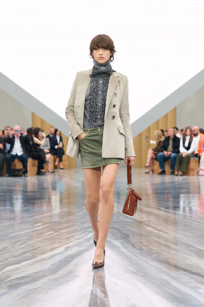 Für den Look wird der Kragen des Blazers leicht nach innen geklappt. Anschließend werden die beiden Revers vorne mit einer oder mehreren Broschen fixiert. Dadurch entsteht eine neue Silhouette – fast wie ein Wickel-Top, nur strukturierter und eleganter. Das Ergebnis wirkt gleichzeitig lässig und durchdacht. Genau diese Mischung macht den Look so besonders.