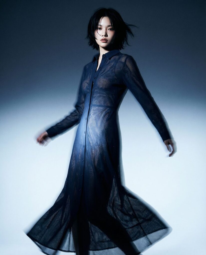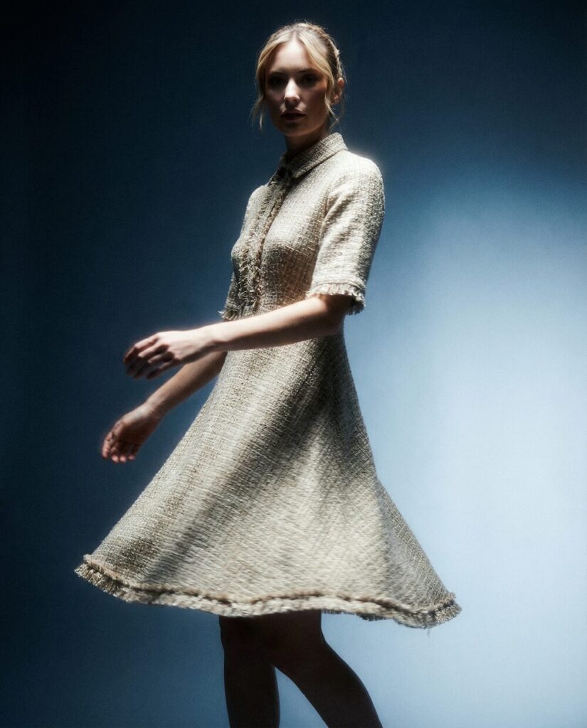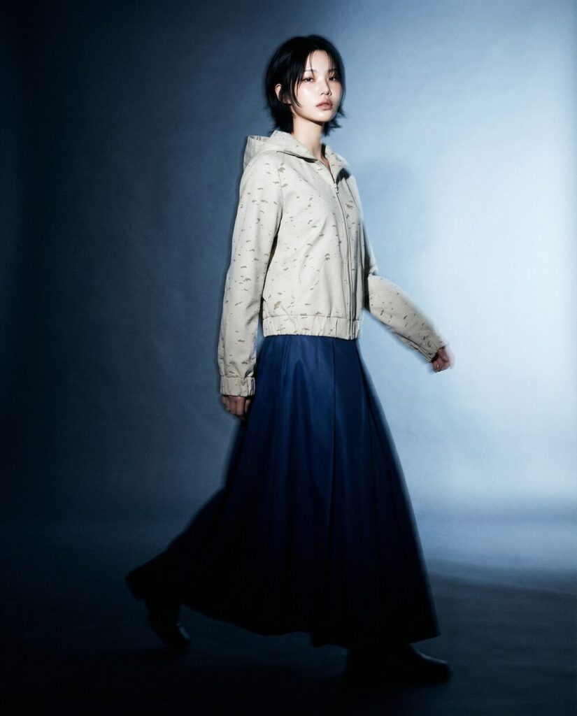 Die Stoffe wirken wie eigenständige Landschaften: strukturierte Bouclés, perforierte Oberflächen, durchbrochene Gewebe und schimmernde Jacquards erzeugen Tiefe und Bewegung. Was spontan und organisch erscheint, folgt einer klaren inneren Logik – ähnlich wie Blattadern, Lichtreflexe im Wald oder die feinen Verästelungen eines natürlichen Systems. Auch die Silhouetten greifen dieses Prinzip auf: präzise geschnittene Jacken treffen auf fließende Volumen, kompakte Formen auf weiche Linien. Bewegung entsteht hier nicht als Effekt, sondern aus der Konstruktion selbst.