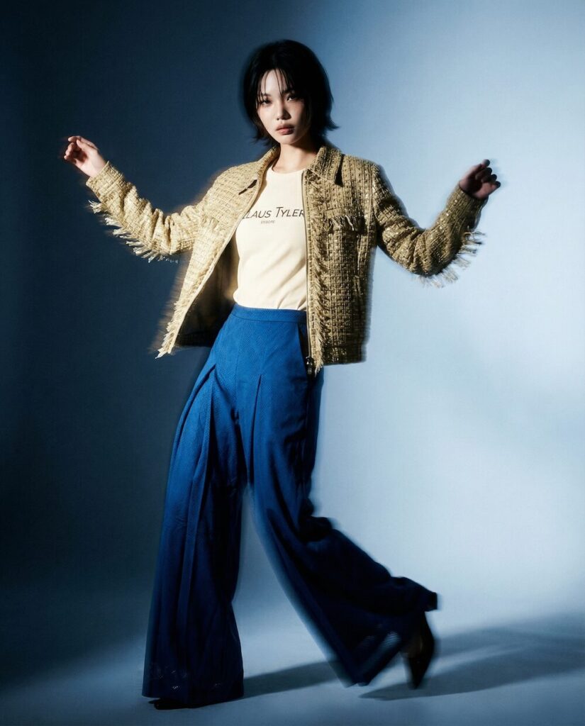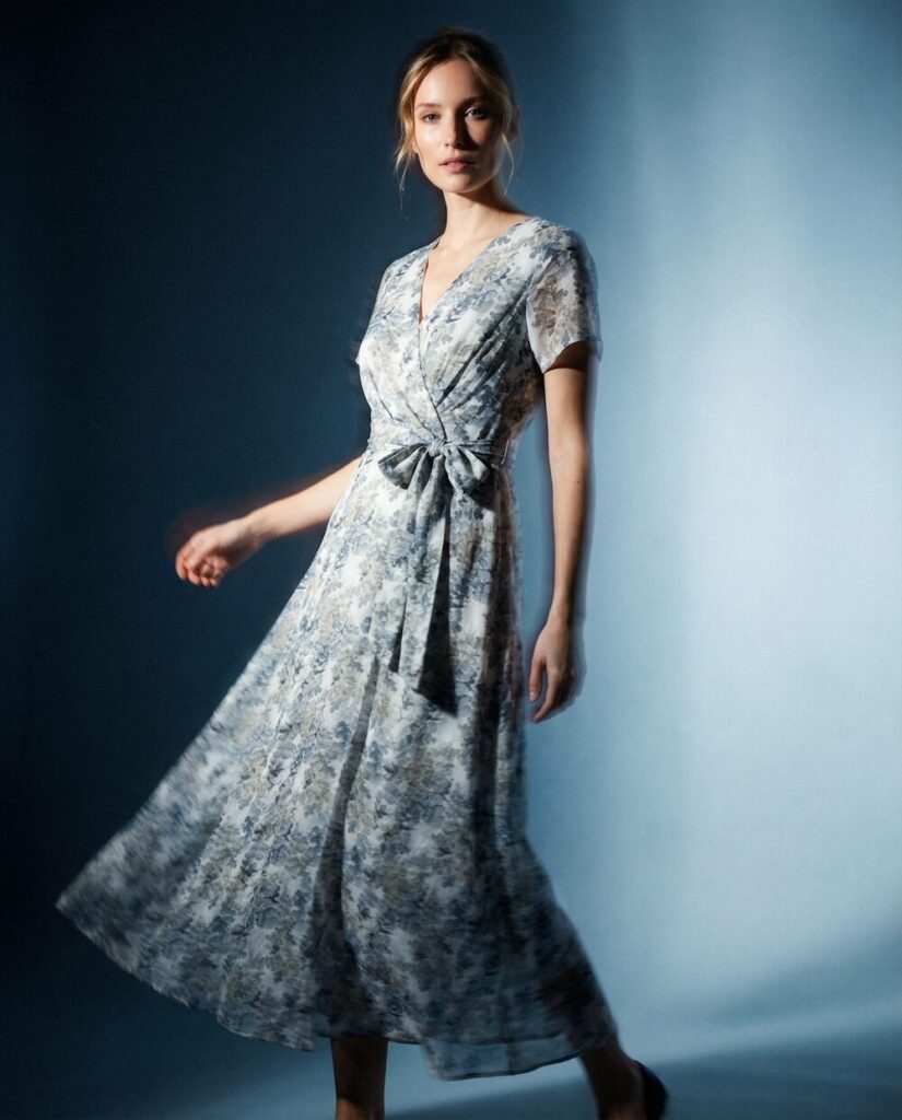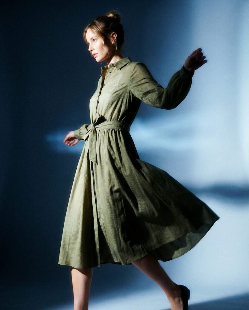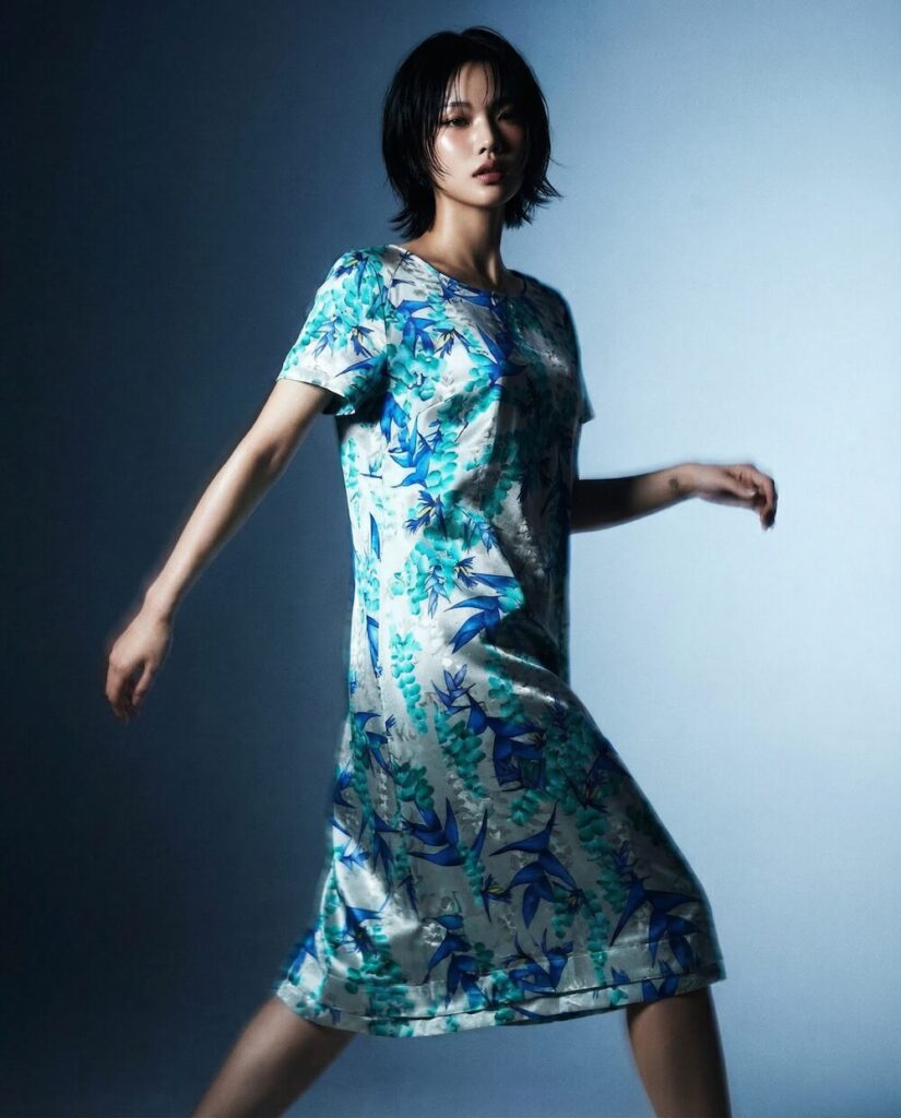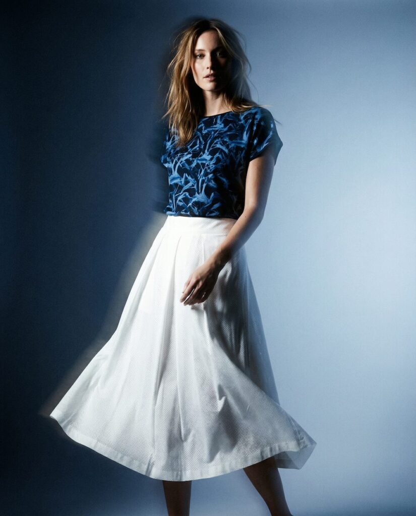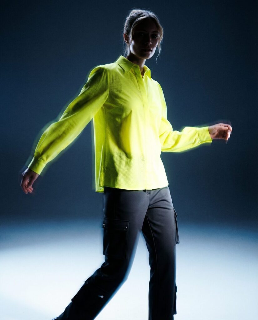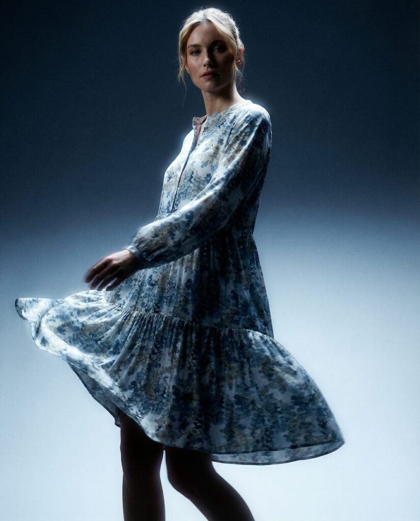 Ein zentrales Element der Kollektion sind die Prints, die wie textile Kunstwerke wirken. Das Motiv „Heliconia in Bewegung“ übersetzt Blattstrukturen in kühle Blautöne und schafft eine fast meditative Tiefe. Die abstrahierten Formen wirken wie eingefrorene Bewegung – ruhig und dennoch lebendig. Im Kontrast dazu steht „Florale Explosionen“: ein intensives Zusammenspiel aus Gelb, Blau und Schwarz, das an expressive Acrylmalerei erinnert. Hier brechen Farben auf, verdichten sich und treffen auf die ruhigeren Stoffe der Kollektion – ein bewusst gesetzter Spannungsmoment.