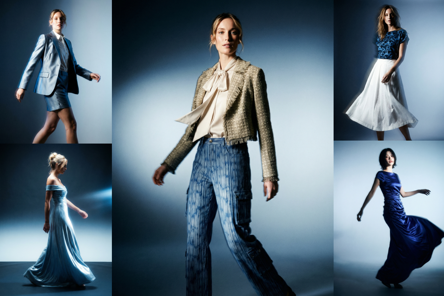 Die Farbpalette bewegt sich zwischen Sand, Stroh und Stein und wird durch kühle Blautöne ergänzt. Akzente in Irisweiß, Gold und tiefem Nachtblau setzen gezielte Kontraste. Besonders die Blaunuancen ziehen sich als wiederkehrendes Element durch die Kollektion – mal ruhig und flächig, mal verdichtet in grafischen Prints. So entsteht ein visuelles Gleichgewicht zwischen Dichte und Leichtigkeit.